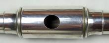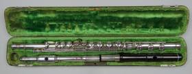 Diese Seite bearbeiten Links hierher Inhaltsverzeichnis Objekt-Nr. 2015-151 Alfred G. Badger, New York / USA Zylindrische Böhmflöte in C, Silber Um 1880 * Erläuterungen zum Inventar siehe Legende Objekt-Nr. 2015-151 Alfred G. Badger, New York / USA Zylindrische Böhmflöte in C, Silber Um 1880 KLANGBEISPIEL 1: Antonin Dvorak, Romantische Stücke Nr.1 op. 75 (mit Holz-Kopfstück gespielt) 182_151_a._badger_mit_kopfstueck_holz_in_a._dvorak_romantische_stuecke_nr._1.mp3 KLANGBEISPIEL 2: Antonin Dvorak, Ballada op. 15 (mit Silber-Kopfstück gespielt) 180_151_a._bager_mit_silberkopfstueck_in_a._dvorak_ballada_op._15.mp3 Konstruktion: Silber. H-Fuss. Kopfstück, Korpus und Fussteil aus gelötetem Silberrohr. Kopfstück mit walzenförmiger Mundlochumkleidung (innen Holz); Mundloch oval. Korkspindel (?) mit Indexstift. Klappendeckel geschlossen. G offset. Gis geschlossen. C/D- und Cis/Dis-Triller. Zusatzhebel für H. C- und H-Klappenhebel am Fussteil in Rollenform. Auflage für lH 1 aus Elfenbein. Unteres Ende des Fussteils trichterförmig erweitert. Zweites Kopfstück aus Kokus-Holz. Masse: Lt 71.2 / Ls 63.0 / DM 19.0; am Ende des Fusssteils 23.0 / ML 11.7 x 10.4 (Silber); 11.7 x 10.0 (Holz) / A1 = ca. 448 Hz Signatur: auf Korpus / (auf schildförmiger Goldplaquette inmitten dekorativer Gravur) W. H. / FURNEY ( Besitzer-Plaquette anstelle der Hersteller-Signatur?) /. Auf Holz-Kopfstück / (Lyra) / A. G. BADGER / NEW - YORK / (Lyra) /. Etui original Zustand: 2 = Silber-Kopfstück mit kleinen Dellen Spieleigenschaften: 3 = heller, strahlender Klang. Intonation sehr gut Seltenheit: 3 Hersteller: Alfred G. Badger (ca. 1815 – 1892) etablierte sich 1845 in New York als selbständiger Flötenbauer. Er trat engagiert für das Böhmsystem ein (u.a. in seiner Publikation ‚History of the Flute‘,1875) und baute entsprechende Instrumente von hoher Qualität. 1859 erwarb Badger von Goodyear die Lizenz zur Verwendung von Ebonite (mit Schwefel gehärteter Kautschuk) im Instrumentenbau und stellte als erster Flöten, resp. Kopfstücke aus diesem Material her. Beim vorliegenden 2. Kopfstück handelt es sich aber eindeutig um Holz (Maserung sichtbar). von admin